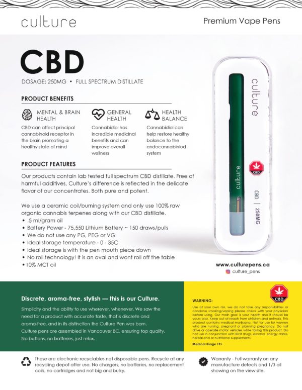 Culture Pens – Culture Green (CBD) – 0.5ml – 250mg CBD | BC Weed Edible CanadaCulture Pens – Culture Green (CBD) – 0.5ml – 250mg CBD | BC Weed Edible Canada