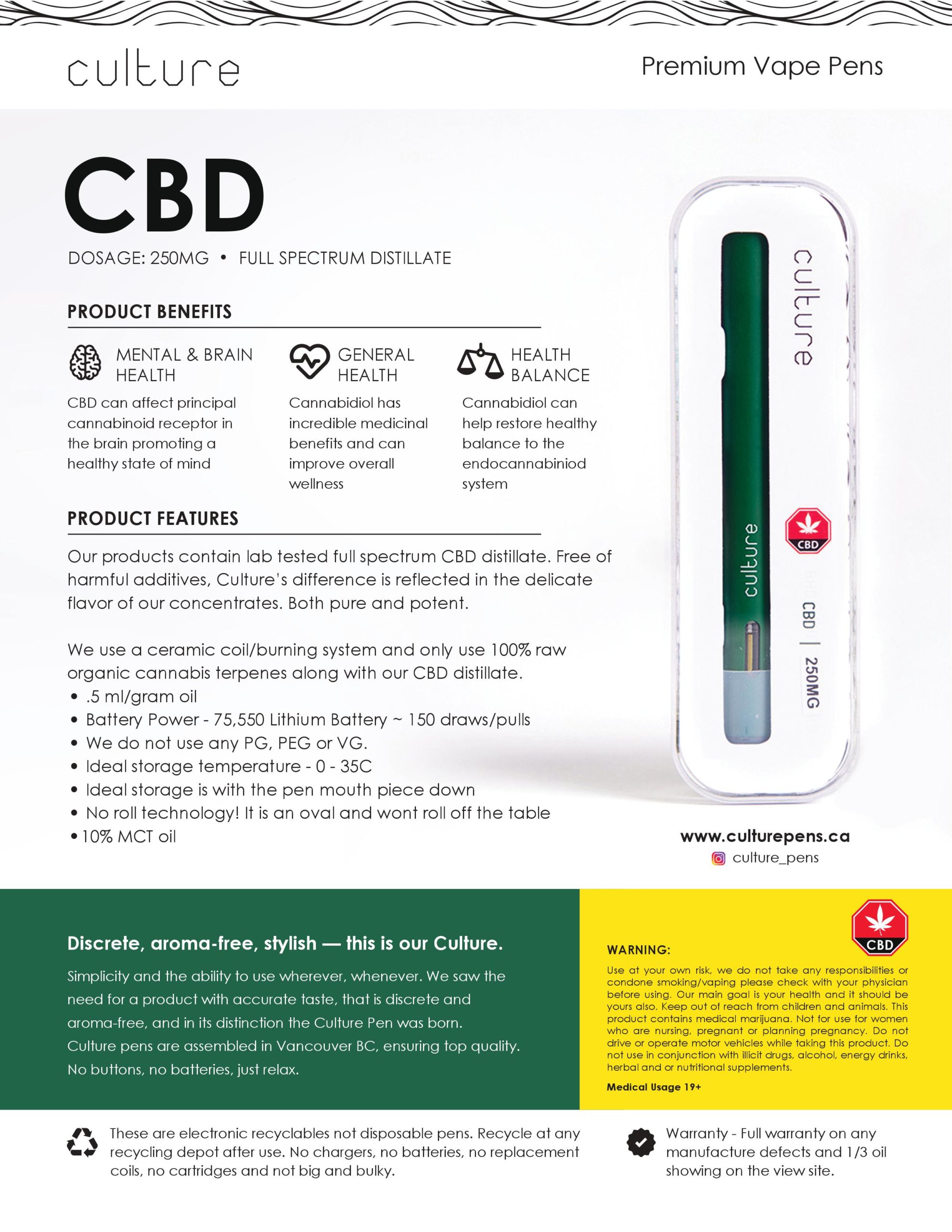 These disposable CBD vape pens from Culture come pre-loaded with 250MG of CBD Full Spectrum Distillate. This blend is extremely low THC (0.2% or less) and created with fast acting, long lasting pain relief in mind. A quick pull relieves headaches, muscle pain, and other chronic pains fast. With no THC you can go about your day with no psychoactive effects. With no battery to recharge, all you do is take a drag and enjoy. You can expect to get approx. 150 pulls from the built in Lithium Battery and Ceramic Coil & Burner. Ideal storage is at temperatures above freezing but below 35 degrees Celsius, and stored with the pen cap down to eliminate burner issues.